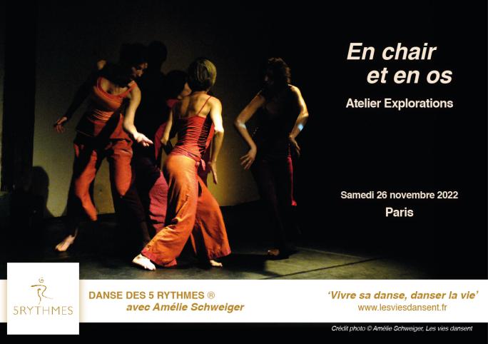L'atelier proposera une rencontre de la Danse des 5 Rythmes® avec d'autres pratiques corporelles, expérientielles et expressives: approche somatique, danse contact, improvisation instantanée. Cette mise en résonance permettra d'approfondir la perception de notre physicalité et la richesse de nos échanges.