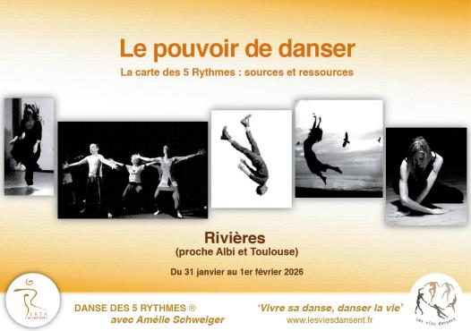 Danser, c’est reprendre le pouvoir d’être pleinement vivant·e. C’est oser se mouvoir, se dévoiler, se transformer. Ce stage vous propose une exploration en profondeur de la carte des 5 Rythmes®. Chaque rythme sera un élan et une source de créativité, une énergie, une philosophie et une poésie pour explorer corps, émotions et imagination. Un voyage où la danse vous invitera à apprécier et développer l'individualité de votre danse tout en l'assouplissant pour nourrir sa capacité d'évolution et d'expansion. Un voyage où la danse sera une inspiration et une ressource précieuse pour stimuler votre quotidien, cultiver la vitalité et garder l'étincelle. En savoir +